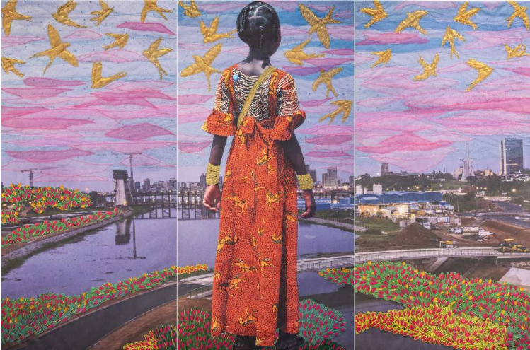Réalisée au fil de ses promenades matinales dans la capitale ivoirienne, Alba’hian (qui signifie « la première lumière du jour » en agni) capture la beauté intime du lever du soleil. Imprimées sur toile de coton et rehaussées de broderies délicates et de tissus d’organza, ses œuvres plongent le spectateur dans une atmosphère douce et contemplative, évoquant des thèmes puissants comme l’enfance, l’amour et la spiritualité.
