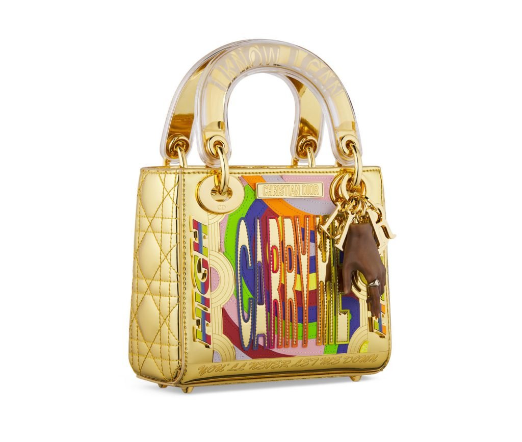 De son côté, l’artiste Lakwena apporte au Lady Dior une dimension résolument pop et subversive. Née à Londres, mêlant ses héritages ougandais et britannique, la créatrice de 39 ans transforme couleurs acidulées et phrases-manifestes en œuvres porteuses d’espoir. Reconnue pour ses fresques murales monumentale, Lakwena transpose ici son vocabulaire visuel sur un format intime, créant un contraste saisissant entre l’échelle de ses interventions publiques et la préciosité d’un objet de luxe.